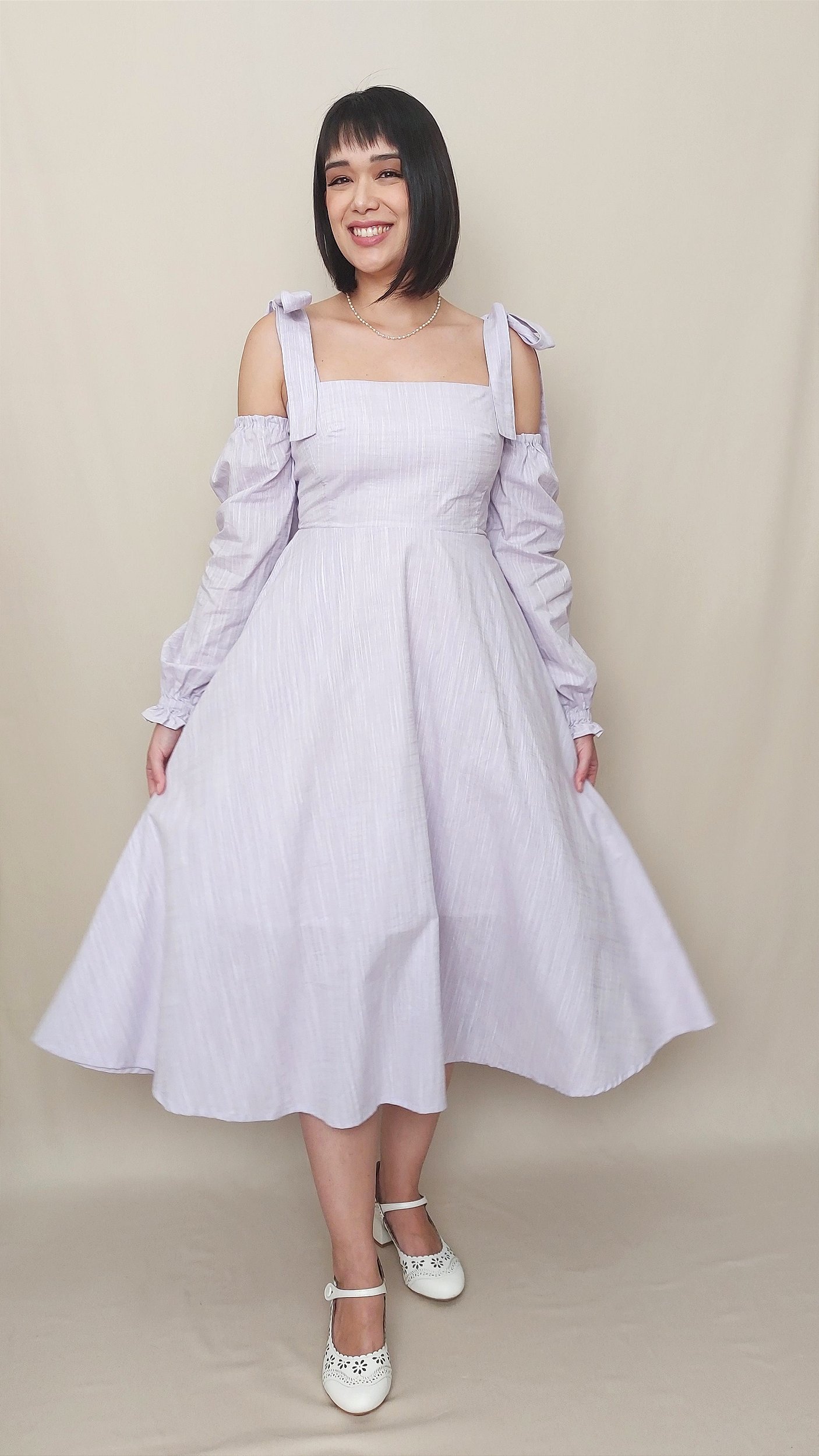 Vestido midi confeccionado 100% em algodão com bolsos invisíveis funcionais nas laterais, mangas removíveis confeccionadas com elástico para maior conforto e alças laçarote ajustáveis. Cor lilás com mesclas brancas.