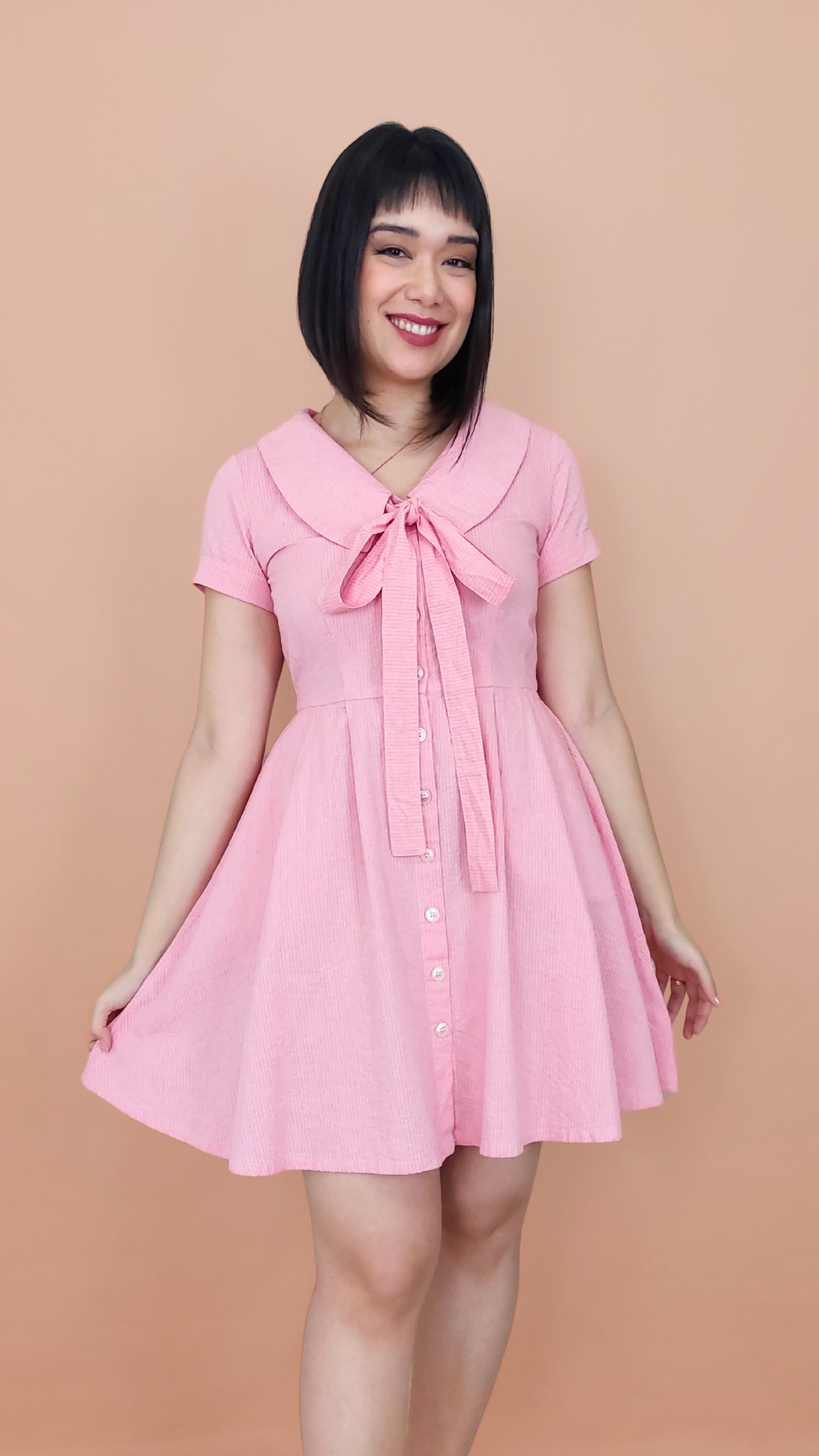 Inspirado pela delicadeza das flores de cerejeira, o Vestido Flor de Cerejeira combina o romantismo retrô com um toque de moda asiática. Em um suave tom de rosa, ele traz um decote em V que valoriza o busto e uma gola Peter Pan, adicionando charme e delicadeza à peça. O vestido acompanha um laçarote removível, que pode ser usado na gola, na cintura ou retirado para um visual mais clean.